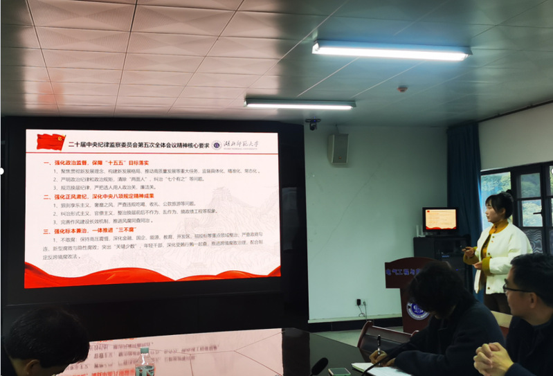在交流发言环节,吴博同志围绕党的二十届四中全会精神、二十届中央纪律检查委员会第五次全体会议精神,结合思想和工作实际进行了研讨。他表示要深化思想认识,坚守育人初心,将全会精神融入到日常教学,明确思政教育与廉洁从教的关联,严守廉洁底线,用爱心与责任引导学生扣好人生第一粒扣子,为培养时代新人贡献力量。